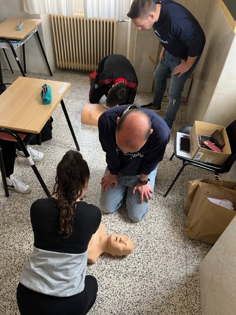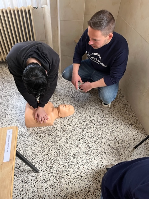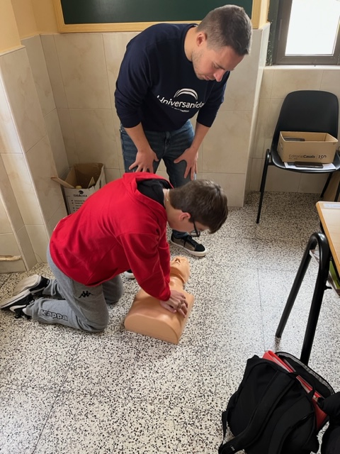 Finalizaron la charla con un taller práctico de reanimación cardio pulmonar (RCP) en la que participaron todos los alumnos de la clase, utilizando unos muñecos para poder aprender a realizar de manera efectiva esta maniobra que puede salvar una vida.
